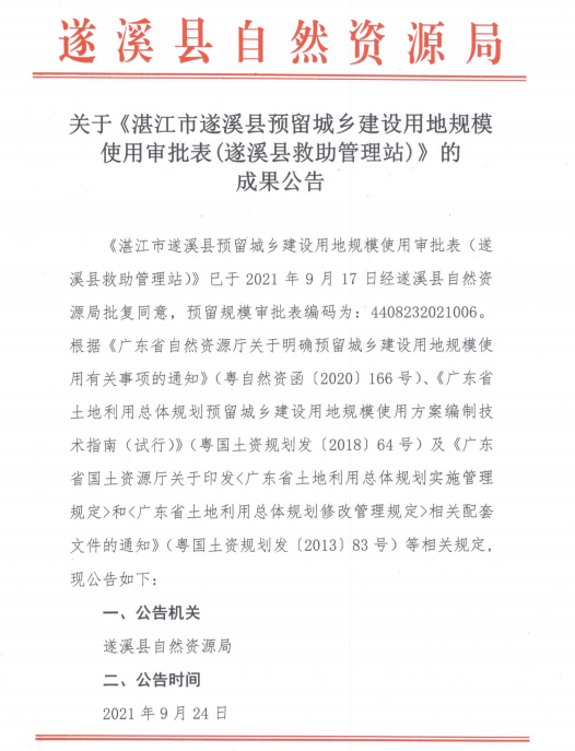 關(guān)于《湛江市遂溪縣預(yù)留城鄉(xiāng)建設(shè)用地規(guī)模使用審批表(遂溪縣救助管理站)》的成果公告