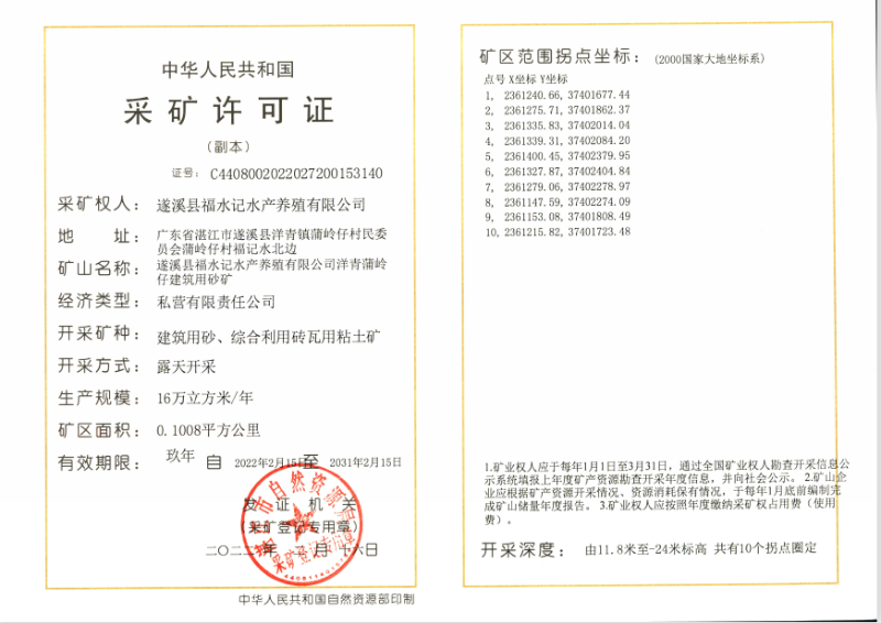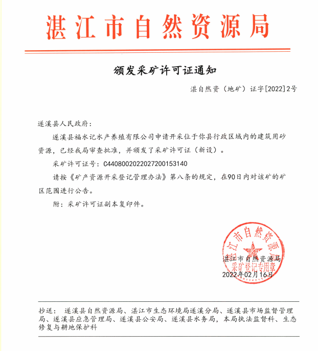 頒發(fā)采礦許可證通知 湛自然資(地礦)證字[2022]2號