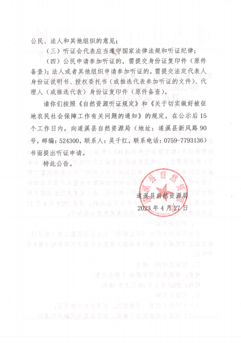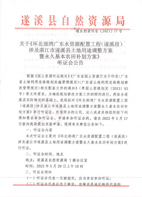 關于《環(huán)北部灣廣東水資源配置工程(遂溪段)涉及湛江市遂溪縣土地用途調整方案暨永久基本農田補劃方案》聽證會公告