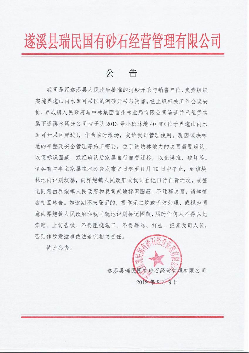 遂溪縣瑞民國(guó)有砂石經(jīng)營(yíng)管理有限公司公告