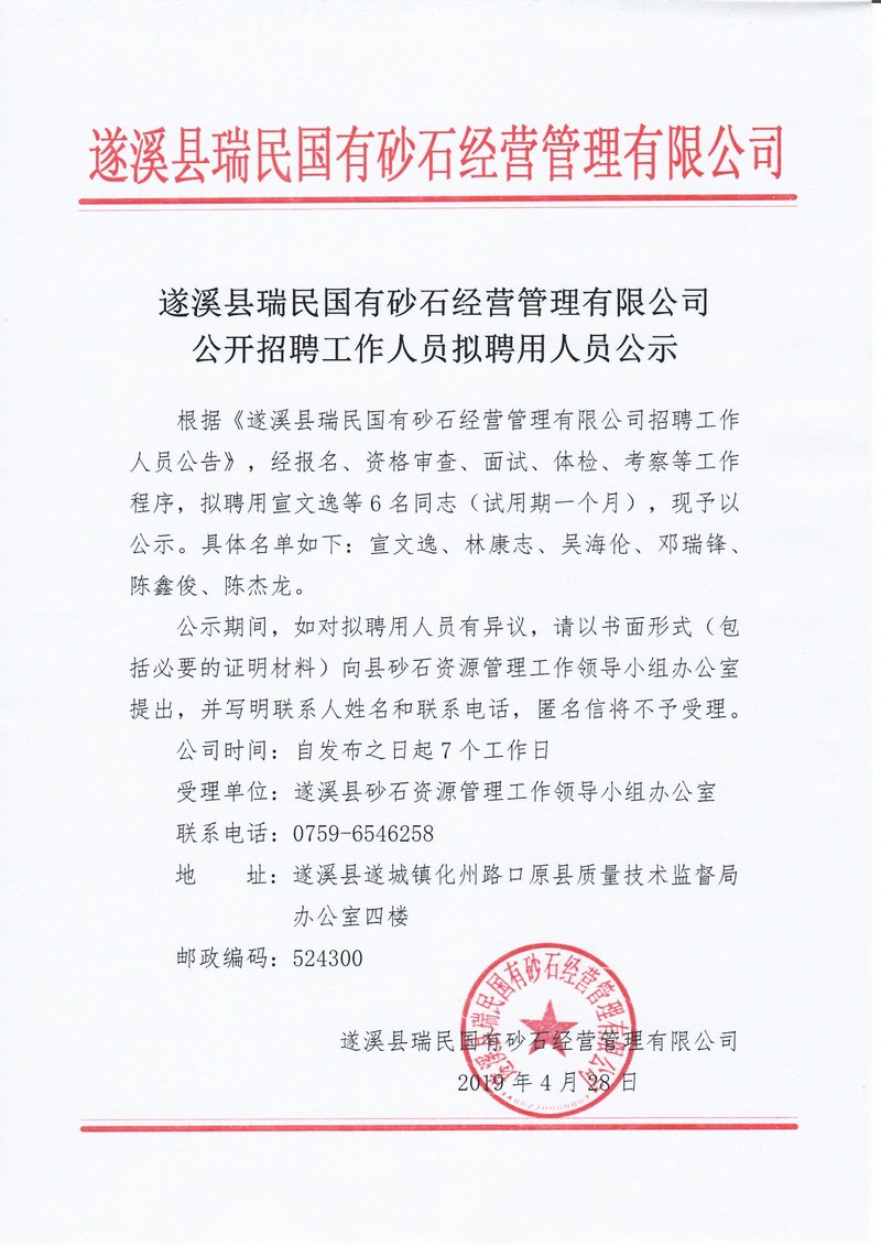 遂溪縣瑞民國(guó)有砂石經(jīng)營(yíng)管理有限公司公開招聘工作人員擬聘用人員公示