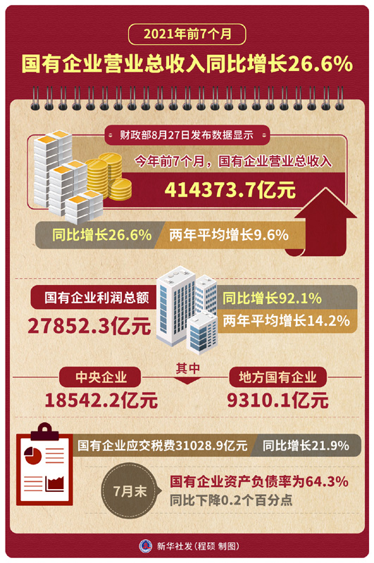 圖表:前7個(gè)月國有企業(yè)營業(yè)總收入同比增長26.6% | | 作者: | 來源:中國政府網(wǎng) | 時(shí)間:2021-08-30 10:36:14 點(diǎn)擊數(shù):- 圖表:前7個(gè)月國有企業(yè)營業(yè)總收入同比增長26.6% 新華社發(fā) 程碩 制圖 【打印正文】