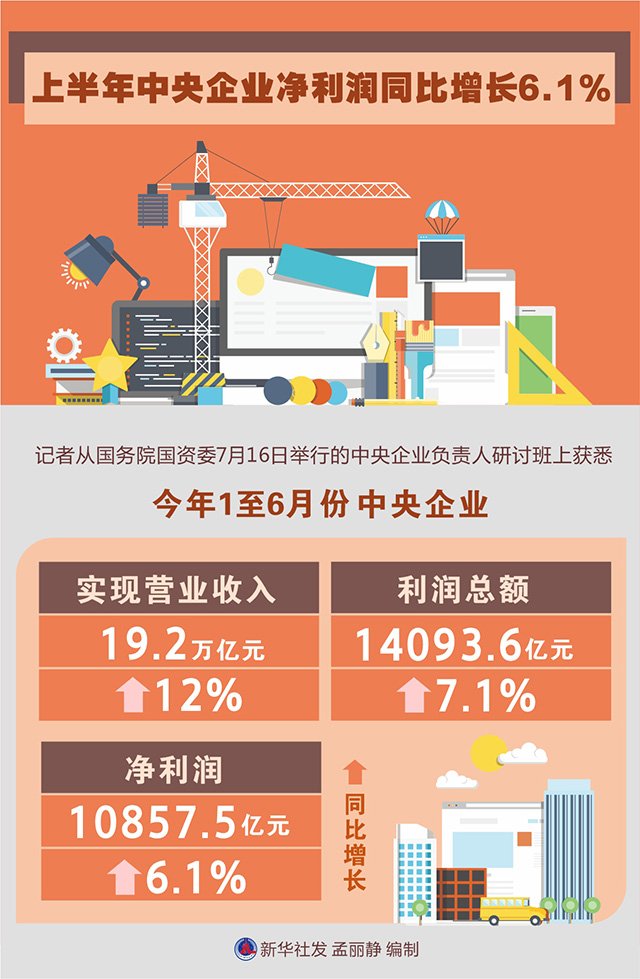 圖表:上半年中央企業(yè)凈利潤同比增長6.1% | | 作者: | 來源:中國政府網(wǎng) | 時間:2022-07-18 15:16:14 點擊數(shù):- 記者從國務(wù)院國資委7月16日舉行的中央企業(yè)負責人研討班上獲悉,今年1至6月份,中央企業(yè)實現(xiàn)營業(yè)收入19.2萬億元、利潤總額14093.6億元、凈利潤10857.5億元,同比分別增長12%、7.1%、6.1%。 新華社發(fā) 孟麗靜 編制 【打印正文】