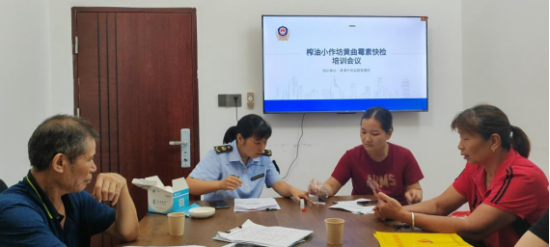 培訓會上仔細解讀了食品生產(chǎn)加工小作坊管理相關要求,提醒督促各小作坊嚴格落實食品安全主體責任,按照《食品生產(chǎn)加工小作坊檢查表》填寫完善自查報告、做好日常生產(chǎn)記錄。同時,針對榨油過程中可能產(chǎn)生的有極強致癌性的黃曲霉素B1,采取現(xiàn)場教學的方式,向參會人員科普了黃曲霉素危害性,詳細介紹黃曲霉素B1試劑的使用方法,現(xiàn)場演示操作如何使用快檢試劑檢測花生油是否存在該毒素。