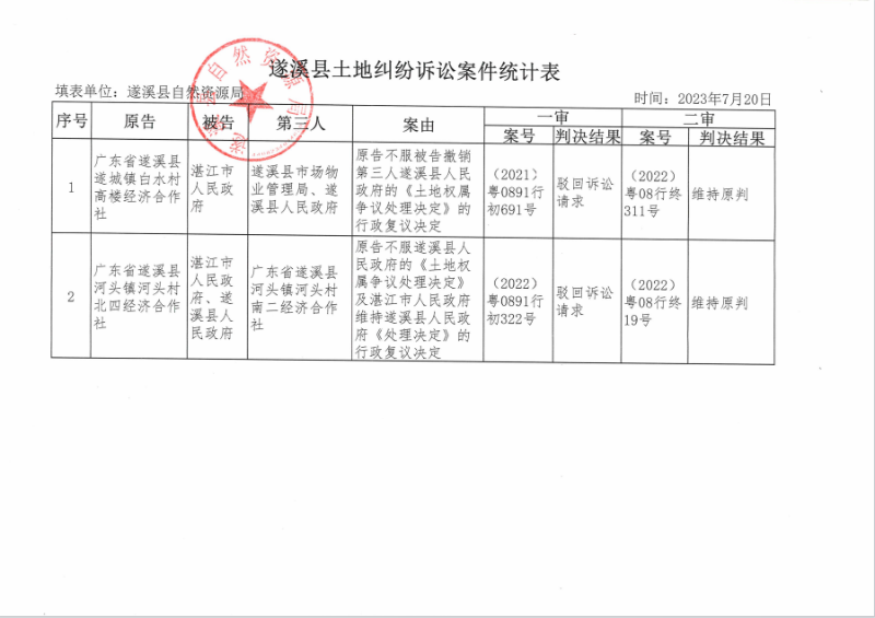 遂溪縣土地糾紛訴訟案件統(tǒng)計(jì)表