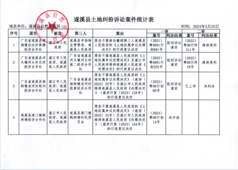 遂溪縣土地糾紛訴訟案件統(tǒng)計(jì)表