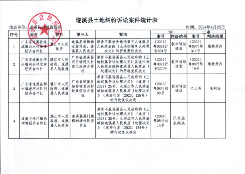 遂溪縣土地糾紛訴訟案件統(tǒng)計表