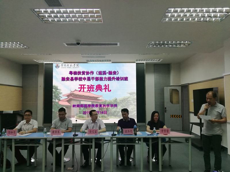 5月14日上午,粵桂扶貧協(xié)作(遂溪-融安)教育幫扶活動(dòng)-融安縣學(xué)校中層干部能力提升培訓(xùn)班在湛江市嶺南師范學(xué)院正式開班。學(xué)院副院長(zhǎng)金義富、融安縣教育局副局長(zhǎng)梁濟(jì)亮、遂溪縣教育局副局長(zhǎng)黃華軍、融安縣粵桂扶貧協(xié)作專責(zé)小組成員余秋寧及全體學(xué)員共同出席開班儀式。