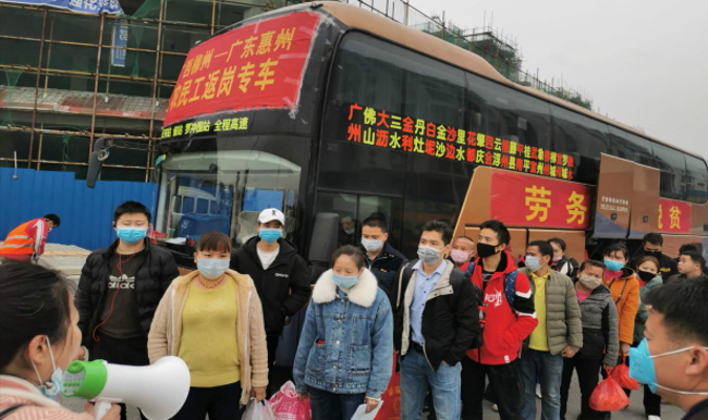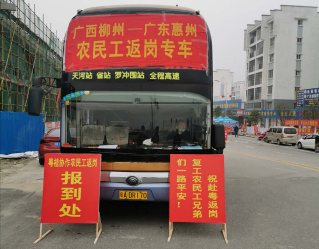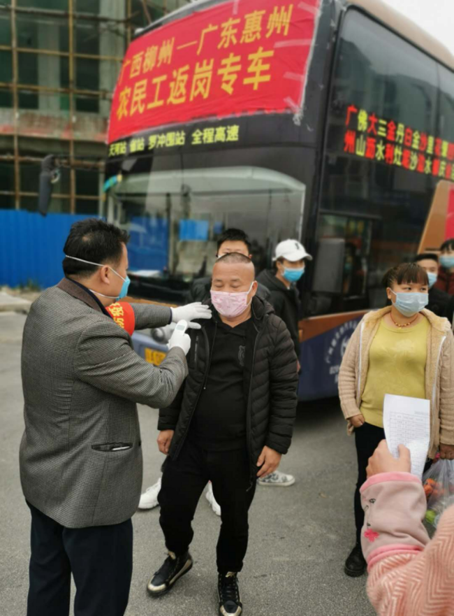 2020年2月20日,融安縣第二批共25名建檔立卡貧困勞動力(均有自我隔離14天的證明)在融安縣城集中乘坐復(fù)工直通專車出發(fā)到廣東惠州相關(guān)公司。