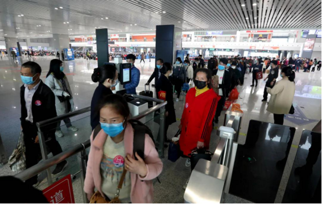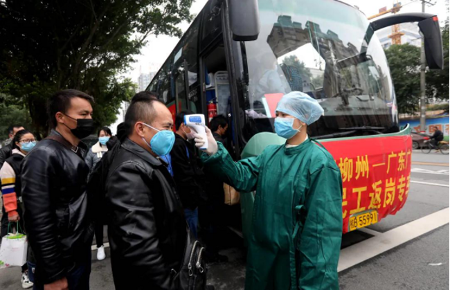 醫(yī)護(hù)人員對(duì)赴粵返崗復(fù)工人員進(jìn)行乘車前檢測(cè)