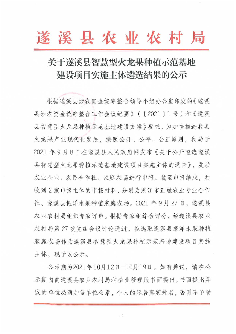 關(guān)于遂溪縣智慧型火龍果種植示范基地建設(shè)項(xiàng)目實(shí)施主體遴選結(jié)果的公示 | | 作者: | 來源:本網(wǎng) | 時(shí)間:2021-10-12 15:36:50 點(diǎn)擊數(shù):- 關(guān)于遂溪縣智慧型火龍果種植示范基地建設(shè)項(xiàng)目實(shí)施主體遴選結(jié)果的公示pdf.pdf 【打印正文】