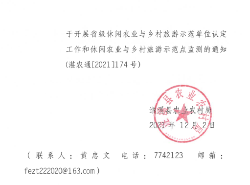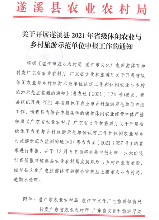 關(guān)于開(kāi)展遂溪縣2021年省級(jí)休閑農(nóng)業(yè)與鄉(xiāng)村旅游示范單位申報(bào)工作的通知 | | 作者: | 來(lái)源:本網(wǎng) | 時(shí)間:2021-12-02 16:14:46 點(diǎn)擊數(shù):- 附件:轉(zhuǎn)發(fā)廣東省農(nóng)業(yè)農(nóng)村廳廣東省文化和旅游廳關(guān)于開(kāi)展省級(jí)休閑農(nóng)業(yè)與鄉(xiāng)村旅游示范單位認(rèn)定工作和休閑農(nóng)業(yè)與鄉(xiāng)村旅游示范點(diǎn)監(jiān)測(cè)的通知.pdf 【打印正文】