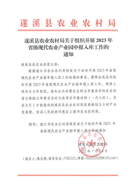 遂溪縣農(nóng)業(yè)農(nóng)村局關(guān)于組織開展2023年省級(jí)現(xiàn)代農(nóng)業(yè)產(chǎn)業(yè)園申報(bào)入庫工作的通知 | | 作者: | 來源:本網(wǎng) | 時(shí)間:2022-07-14 16:38:05 點(diǎn)擊數(shù):- 附件:湛江市農(nóng)業(yè)農(nóng)村局轉(zhuǎn)發(fā)關(guān)于組織開展2023年省級(jí)現(xiàn)代農(nóng)業(yè)產(chǎn)業(yè)園申報(bào)入庫工作的通知.pdf 【打印正文】