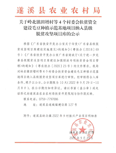 關(guān)于嶺北鎮(zhèn)田增村等4個(gè)村委會(huì)扶貧資金建設(shè)毛豆種植示范基地項(xiàng)目納入縣級(jí)脫貧攻堅(jiān)項(xiàng)目庫(kù)的公示