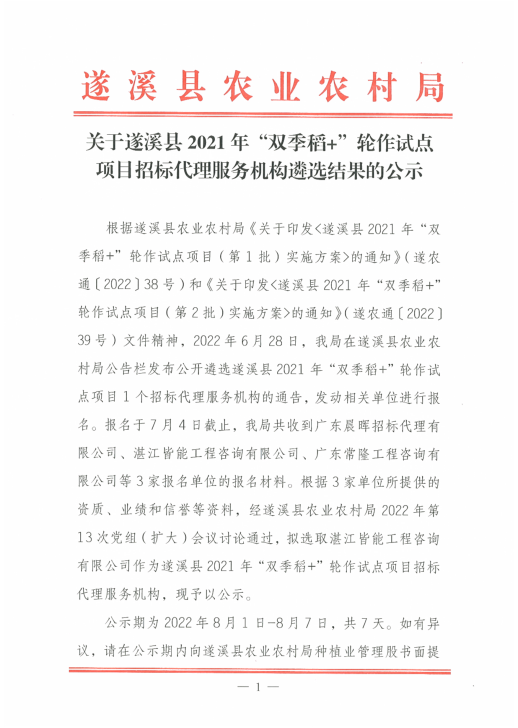關(guān)于遂溪縣2021年“雙季稻+”輪作試點(diǎn)項(xiàng)目招標(biāo)代理服務(wù)機(jī)構(gòu)遴選結(jié)果的公示