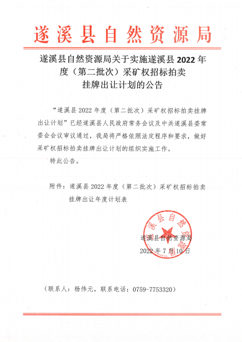 遂溪縣自然資源局關(guān)于實(shí)施2022年度(第二批次)采礦權(quán)招標(biāo)拍賣掛牌出讓計(jì)劃的公告 | | 作者: | 來源:遂溪縣自然資源局 | 時(shí)間:2022-07-10 17:58:01 點(diǎn)擊數(shù):- 附件:遂溪縣2022年度(第二批次)采礦權(quán)招標(biāo)拍賣掛牌出讓年度計(jì)劃表.pdf 【打印正文】