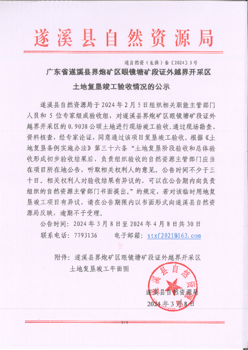 廣東省遂溪縣界炮礦區(qū)眼鏡塘礦段證外越界開采區(qū)土地復(fù)墾竣工驗收情況的公示 | | 作者: | 來源:遂溪縣自然資源局 | 時間:2024-03-08 11:12:43 點擊數(shù):- 附件:遂溪縣界炮礦區(qū)眼鏡塘礦段證外界開采區(qū)土地復(fù)墾竣工平面圖.pdf 【打印正文】
