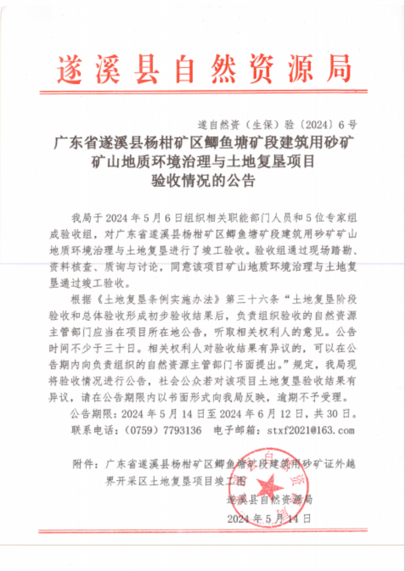 廣東省遂溪縣楊柑礦區(qū)鯽魚塘礦段建筑用砂礦礦山地質環(huán)境治理與土地復墾項目驗收情況的公告