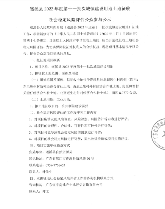 遂溪縣2022年度第十一批次城鎮(zhèn)建設(shè)用地土地征收社會(huì)穩(wěn)定風(fēng)險(xiǎn)評(píng)估公眾參與公示