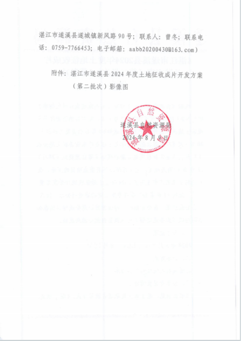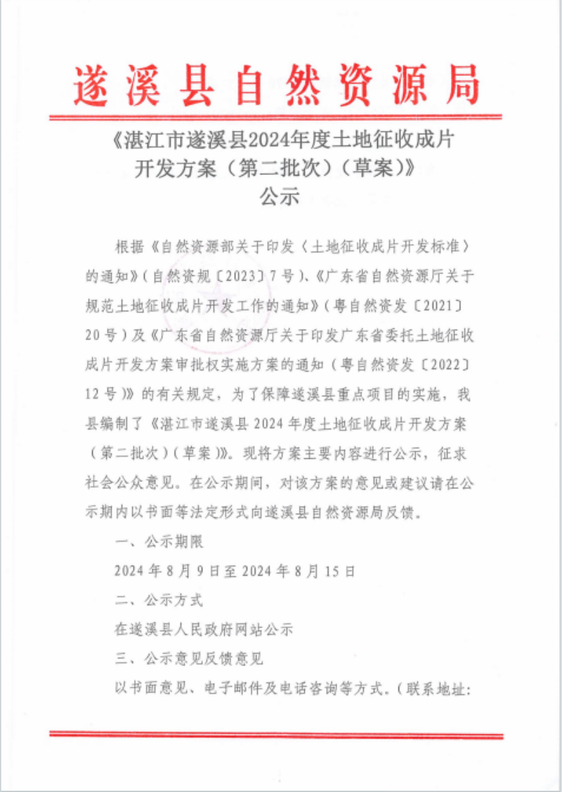 《湛江市遂溪縣2024年度土地征收成片開(kāi)發(fā)方案(第二批次)(草案))》公示