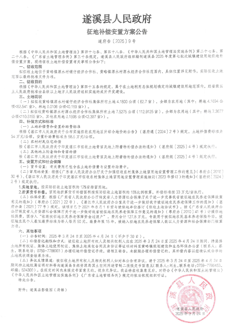 遂溪縣人民政府 征地補(bǔ)償安置方案公告 遂府告〔2025〕9號(hào)