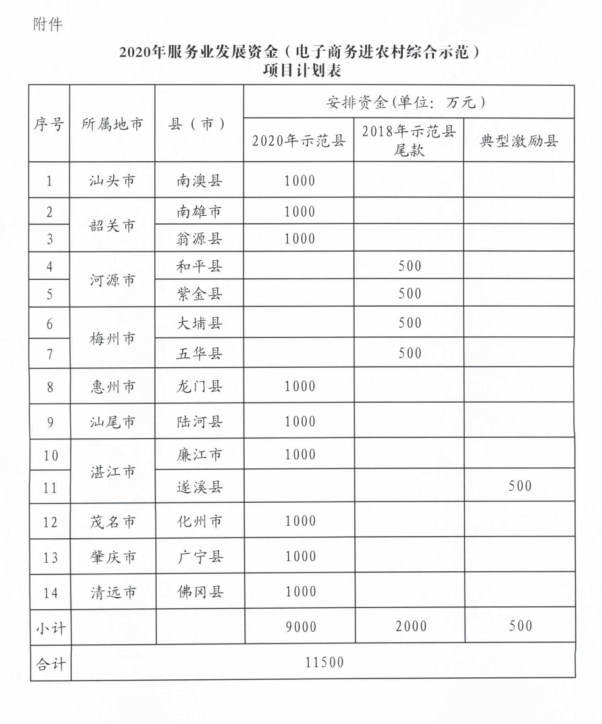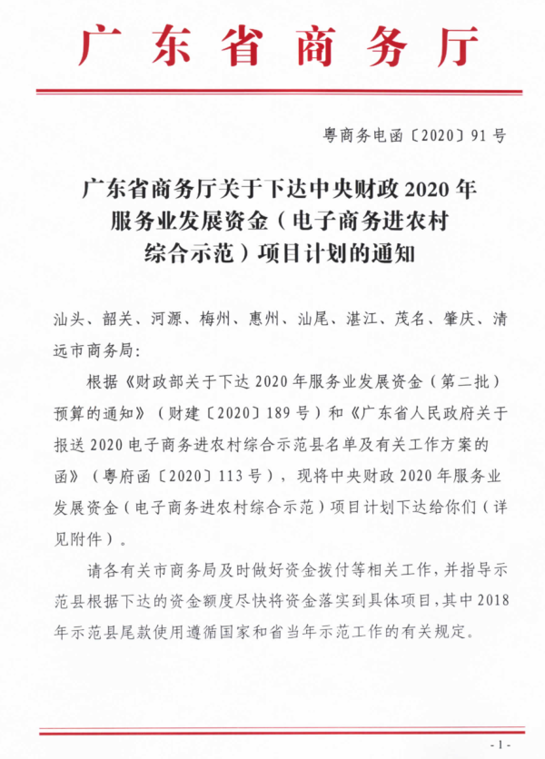 廣東省商務(wù)廳關(guān)于下達(dá)中央財(cái)政2020年服務(wù)業(yè)發(fā)展資金(電子商務(wù)進(jìn)農(nóng)村綜合示范)項(xiàng)目計(jì)劃的通知(粵商務(wù)電函[2020]91號)