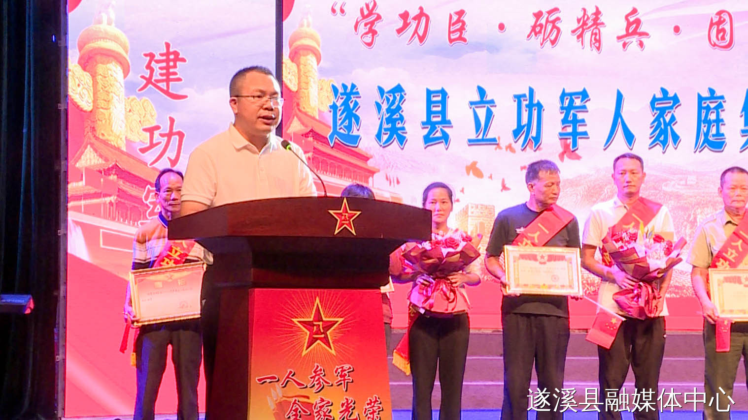 遂溪縣委常委、副縣長龐宇代表縣委、縣政府向立功受獎軍人家庭表示熱烈的祝賀,對廣大軍人家屬一直以來對國防和軍隊建設事業(yè)的關心支持表示衷心的感謝。希望新兵們能把軍旅的“大志”分解成小目標,以功臣的模范標桿,用自己的實際行動,在本職崗位上、備戰(zhàn)征程中為遂溪父老鄉(xiāng)親早傳捷報、頻傳佳音。
