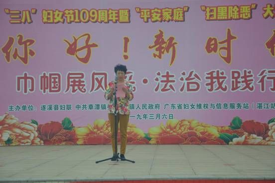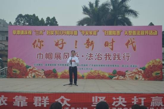 3月6日上午,草潭鎮(zhèn)各界人士及各級婦聯(lián)干部、群眾等約 1500人共歡聚一堂,參加了由遂溪縣婦聯(lián)、中共草潭鎮(zhèn)委、草潭鎮(zhèn)政府、廣東省婦女維權與信息服務站(湛江站 遂溪站)在草潭鎮(zhèn)平安廣場聯(lián)合舉辦的“‘你好新時代’——巾幗展風采、法治我踐行”慶?!叭恕眿D女節(jié)109周年暨“平安家庭”普法宣傳活動。遂溪縣婦聯(lián)主席卜小明、遂溪縣人大常委會副主任黃潔、草潭鎮(zhèn)委負責人、鎮(zhèn)長梁盤等領導出席這次活動,同時出席活動的還有縣婦聯(lián)副主席趙梅,草潭鎮(zhèn)領導班子成員及部分縣、鎮(zhèn)人大代表。