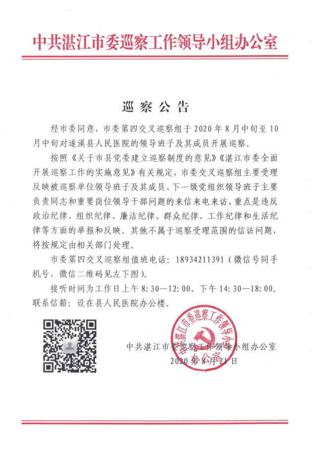 巡察公告(遂溪縣人民醫(yī)院)2020年08月