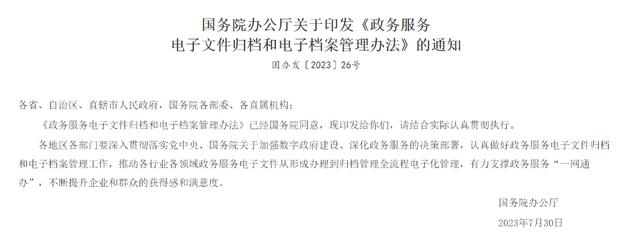 國務(wù)院辦公廳印發(fā)《政務(wù)服務(wù)電子文件歸檔和電子檔案管理辦法》
