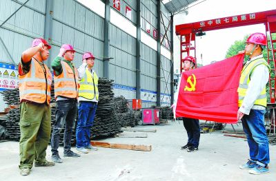 近日,中鐵七局西安公司西安地鐵5號線黨支部開展“不忘初心、牢記使命”主題教育集中學(xué)習(xí)活動。圖為該支部職工黨員在建設(shè)工地重溫入黨誓詞。新華社發(fā)