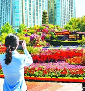 國慶節(jié)前后,北京長安街沿線12處絢麗多姿、造型多樣的花壇吸引了眾多市民觀賞。圖為市民在拍攝“不忘初心”花壇。新華社發(fā)