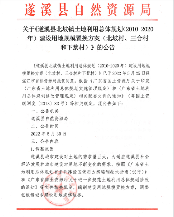 關(guān)于《遂溪縣北坡鎮(zhèn)土地利用總體規(guī)劃(2010-2020年)建設(shè)用地規(guī)模置換方案(北坡村、三合村和下黎村)》的公告 | | 作者: | 來源:遂溪縣自然資源局 | 時(shí)間:2022-05-30 10:53:59 點(diǎn)擊數(shù):- 附圖:預(yù)留規(guī)模落實(shí)圖件.pdf 【打印正文】