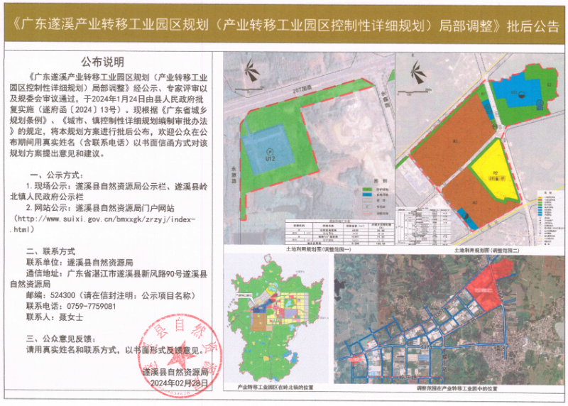 《廣東遂溪產(chǎn)業(yè)轉(zhuǎn)移工業(yè)園區(qū)規(guī)劃(產(chǎn)業(yè)轉(zhuǎn)移工業(yè)園區(qū)控制性詳細(xì)規(guī)劃)局部調(diào)整》批后公告