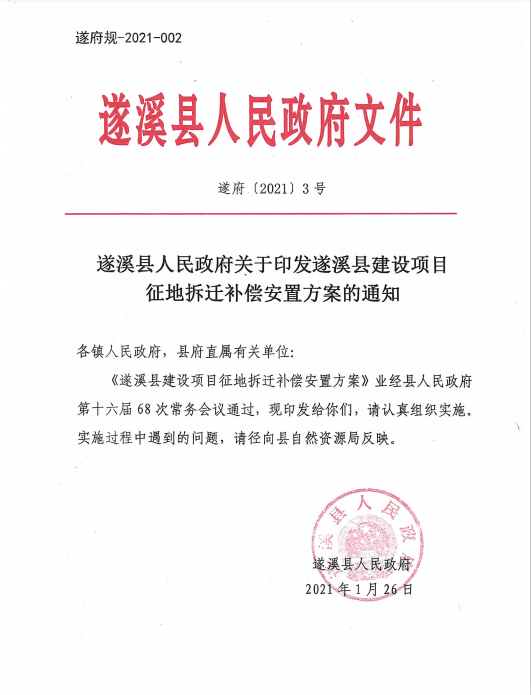 遂府規(guī)-2021-002遂溪縣人民政府關(guān)于印發(fā)遂溪縣建設(shè)項(xiàng)目征地拆遷補(bǔ)償安置方案的通知(遂府〔2021〕3號(hào)) | | 作者: | 來源:遂溪縣自然資源局 | 時(shí)間:2021-01-27 17:29:25 點(diǎn)擊數(shù):- 政策解讀鏈接:《遂溪縣建設(shè)項(xiàng)目征地拆遷補(bǔ)償安置方案》的政策解讀 附件1:遂府規(guī)-2021-001遂溪縣人民政府關(guān)于印發(fā)遂溪縣建設(shè)項(xiàng)目征地拆遷補(bǔ)償安置方案的通知(遂府〔2021〕3號(hào)).pdf 【打印正文】