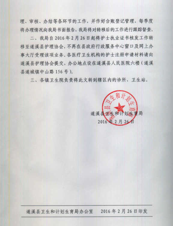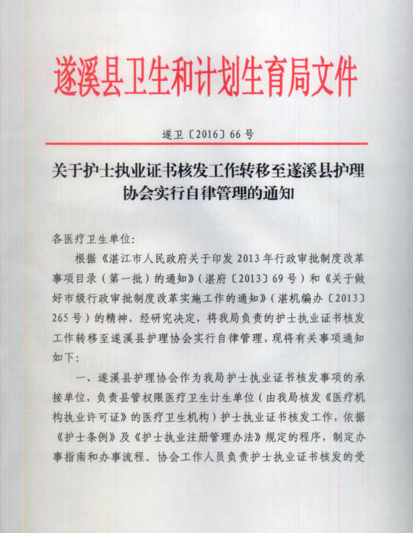 關(guān)于護(hù)士執(zhí)業(yè)證書核發(fā)工作轉(zhuǎn)移至遂溪縣護(hù)理協(xié)會(huì)實(shí)行自律管理的通知