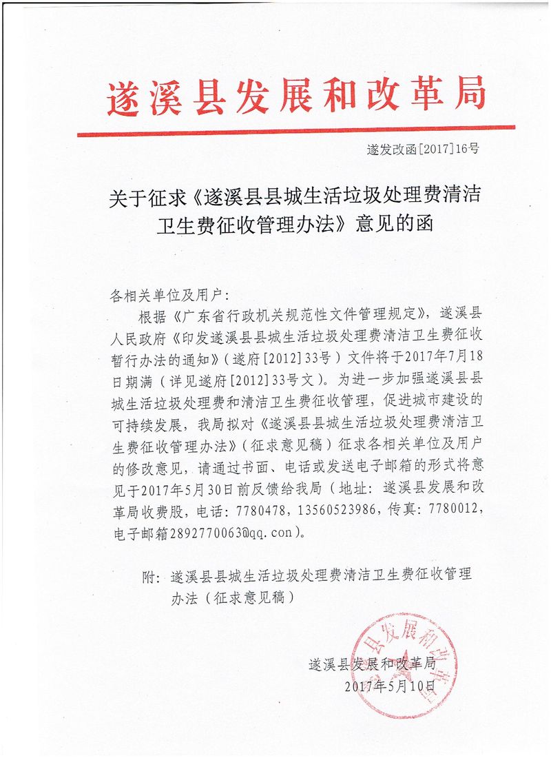 關(guān)于征求縣城生活垃圾處理費(fèi)清潔衛(wèi)生費(fèi)征收管理辦法意見的函 | | 作者: | 來源:本網(wǎng) | 時(shí)間:2017-05-10 15:49:39 點(diǎn)擊數(shù):- 遂溪縣縣城生活垃圾處理費(fèi)清潔衛(wèi)生費(fèi)征收管理辦法(征求意見稿) 【打印正文】