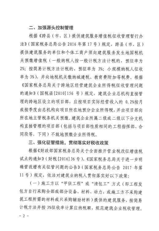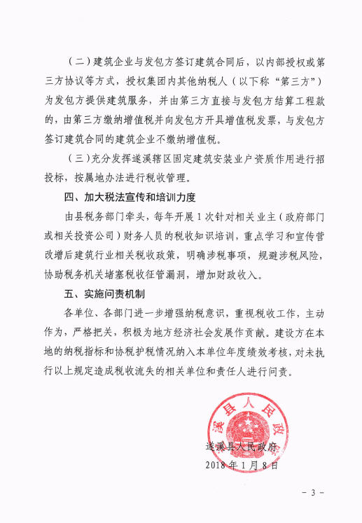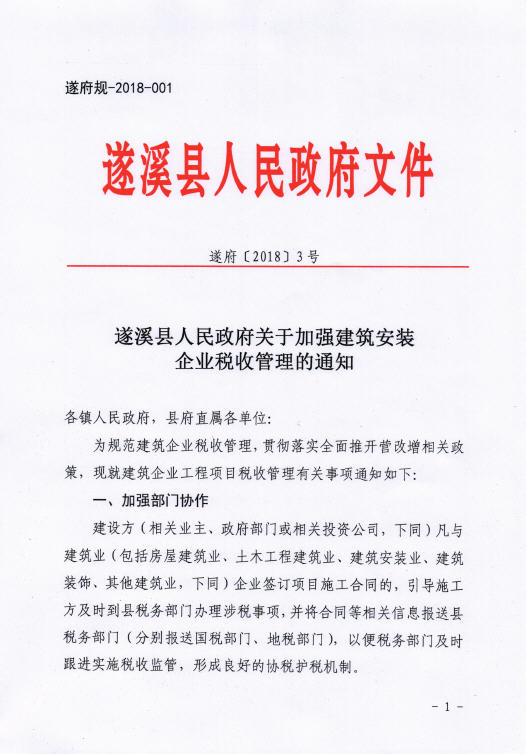 遂府規(guī)—2018—001 遂溪縣人民政府關(guān)于加強(qiáng)建筑安裝企業(yè)稅收管理的通知(遂府〔2018〕3號(hào)) | | 作者:縣人民政府 | 來(lái)源:縣人民政府 | 時(shí)間:2018-01-09 17:57:56 點(diǎn)擊數(shù):- 政策解讀鏈接:關(guān)于 《 加強(qiáng)建筑安裝企業(yè)稅收管理 》 的政策解讀 【打印正文】
