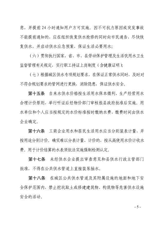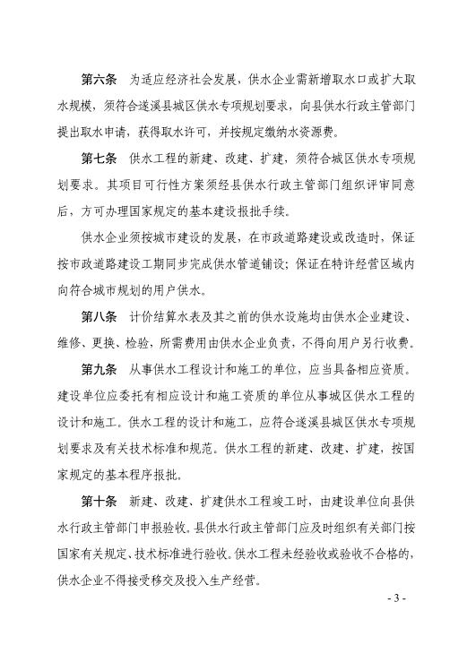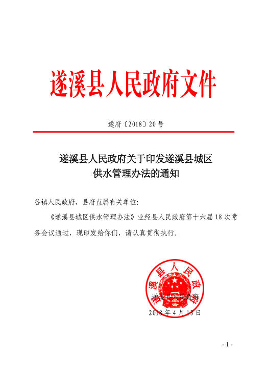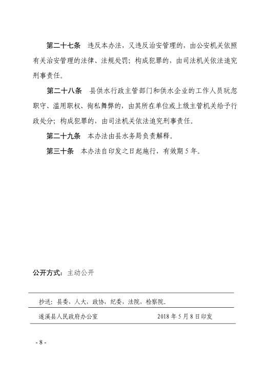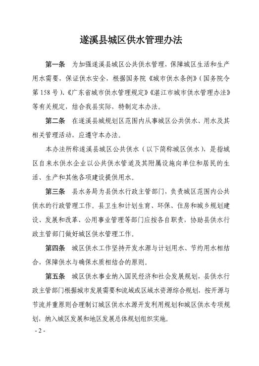 遂府規(guī)—2018—005 遂溪縣人民政府關(guān)于印發(fā)遂溪縣城區(qū)供水管理辦法的通知(遂府〔2018〕20號(hào)) | | 作者:縣人民政府 | 來(lái)源:縣人民政府 | 時(shí)間:2018-04-16 18:04:49 點(diǎn)擊數(shù):- 政策解讀鏈接:關(guān)于 《 遂溪縣城區(qū)供水管理辦法 》 的政策解讀 【打印正文】