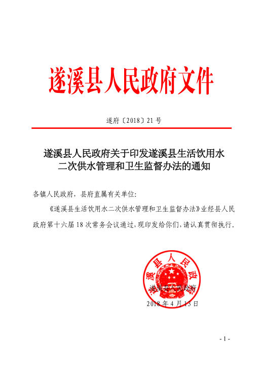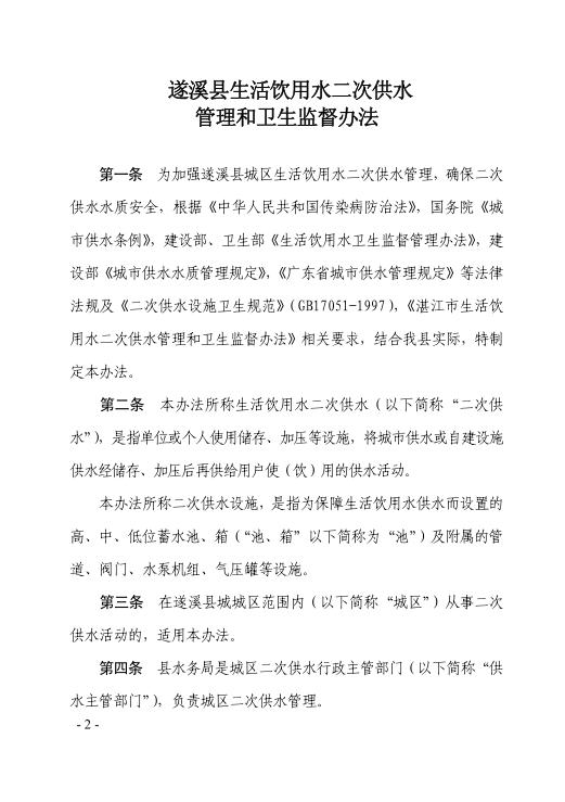 遂府規(guī)—2018—006 遂溪縣人民政府關(guān)于印發(fā)遂溪縣生活飲用水二次供水管理和衛(wèi)生監(jiān)督辦法的通知(遂府〔2018〕21號)