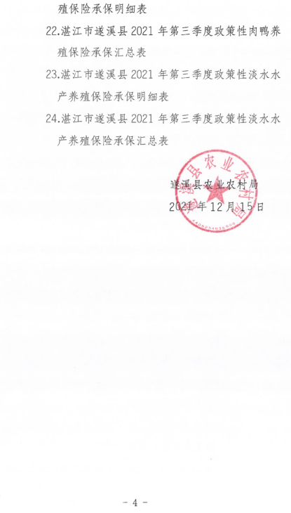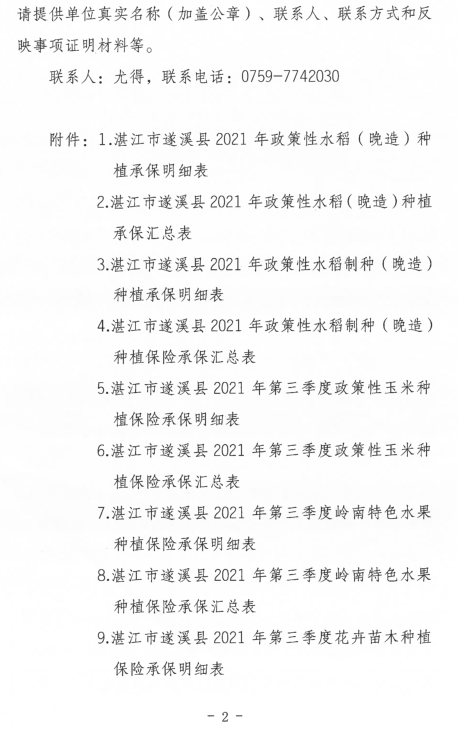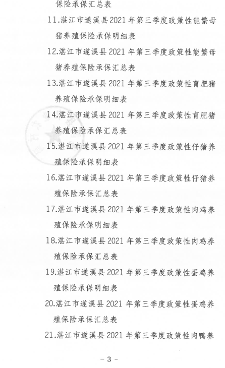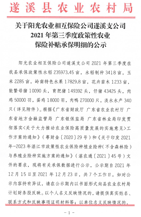 關于陽光農(nóng)業(yè)相互保險有限公司遂溪支公司2021年三季度政策性農(nóng)業(yè)保險補貼承保明細的公示 | | 作者: | 來源:本網(wǎng) | 時間:2021-12-15 09:50:59 點擊數(shù):- 附件:2021年第三季度遂溪縣政策性農(nóng)業(yè)保險承保明細表及匯總表.pdf 【打印正文】