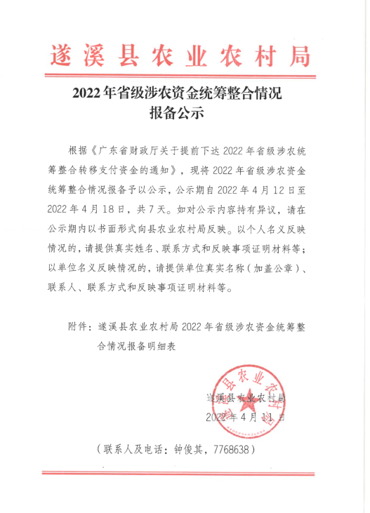 2022年省級(jí)涉農(nóng)資金統(tǒng)籌整合情況報(bào)備公示 | | 作者: | 來(lái)源:本網(wǎng) | 時(shí)間:2022-04-12 15:29:39 點(diǎn)擊數(shù):- 附件:遂溪縣農(nóng)業(yè)農(nóng)村局2022年省級(jí)涉農(nóng)資金統(tǒng)籌整合情況報(bào)備明細(xì)表.pdf 【打印正文】