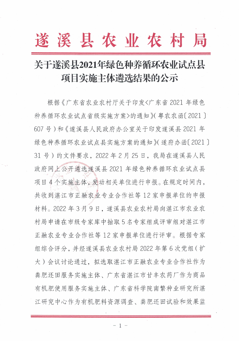 關(guān)于遂溪縣2021年綠色種養(yǎng)循環(huán)農(nóng)業(yè)試點(diǎn)縣項(xiàng)目實(shí)施主體遴選結(jié)果的公示