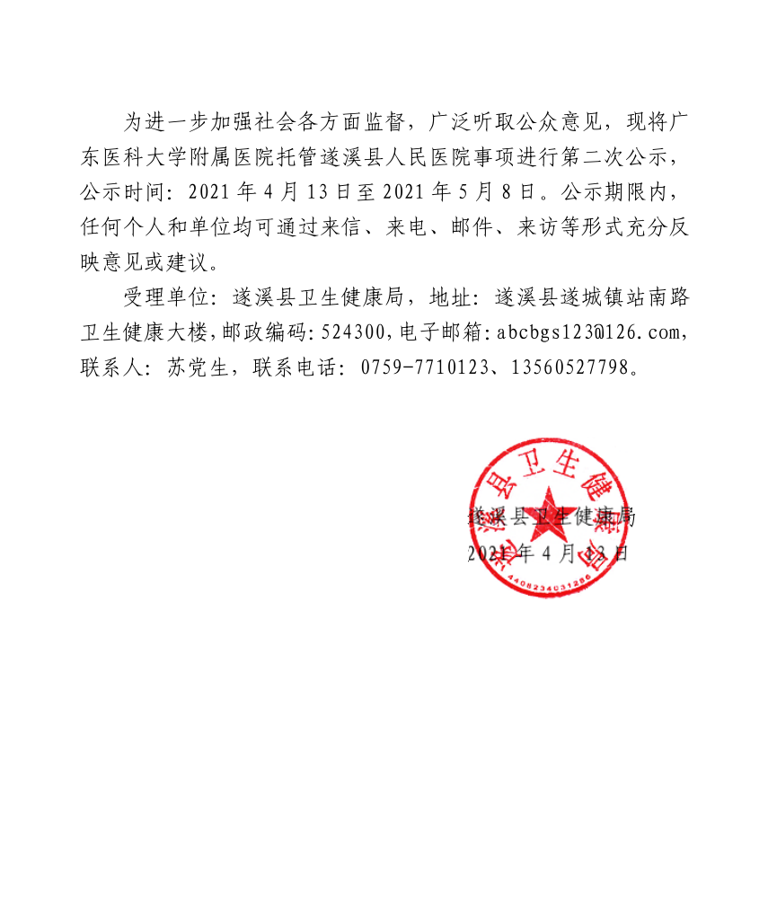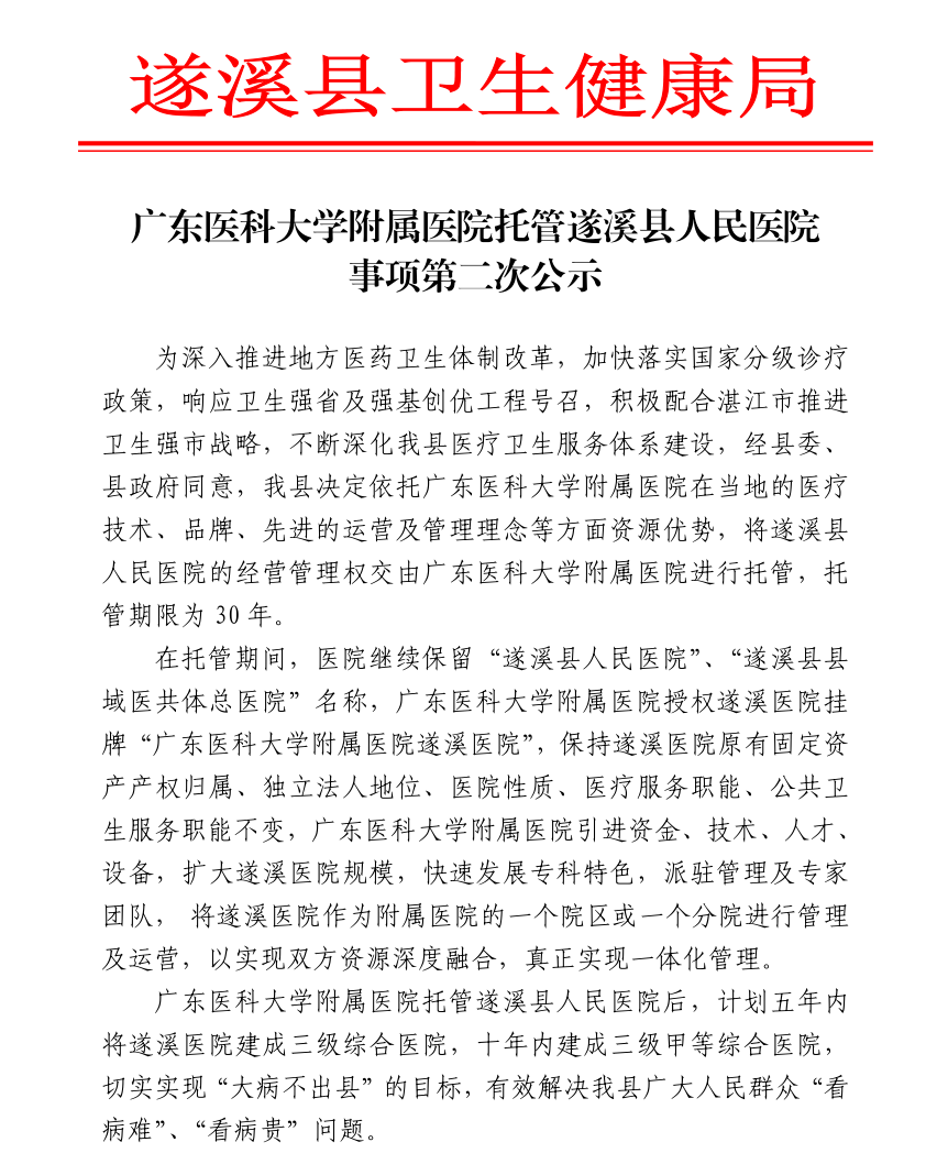 廣東醫(yī)科大學附屬醫(yī)院托管遂溪縣人民醫(yī)院事項第二次公示 | | 作者: | 來源:遂溪縣衛(wèi)生健康局 | 時間:2021-04-13 22:06:24 點擊數(shù):- 廣東醫(yī)科大學附屬醫(yī)院托管遂溪縣人民醫(yī)院事項第二次公示2021-04-13.pdf 【打印正文】