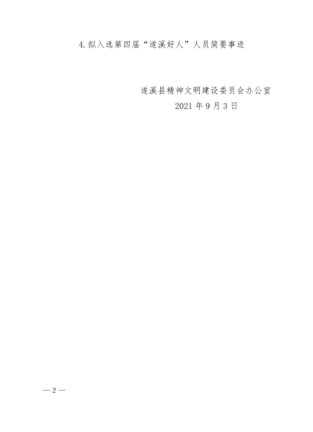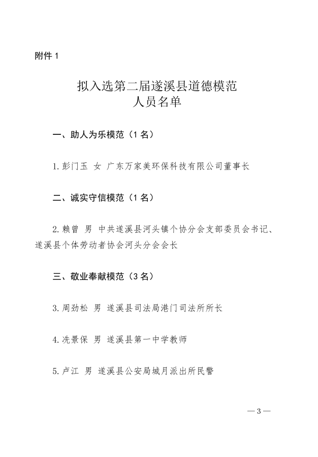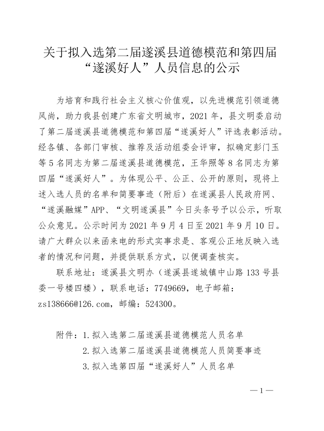 關(guān)于擬入選第二屆遂溪縣道德模范和第四屆“遂溪好人”人員信息的公示 | | 作者: | 來源:遂溪縣精神文明建設(shè)委員會辦公室 | 時間:2021-09-03 18:03:34 點擊數(shù):- 具體事跡請看附件:關(guān)于擬入選第二屆遂溪縣道德模范和第四屆”遂溪好人“人員的公示.pdf 【打印正文】