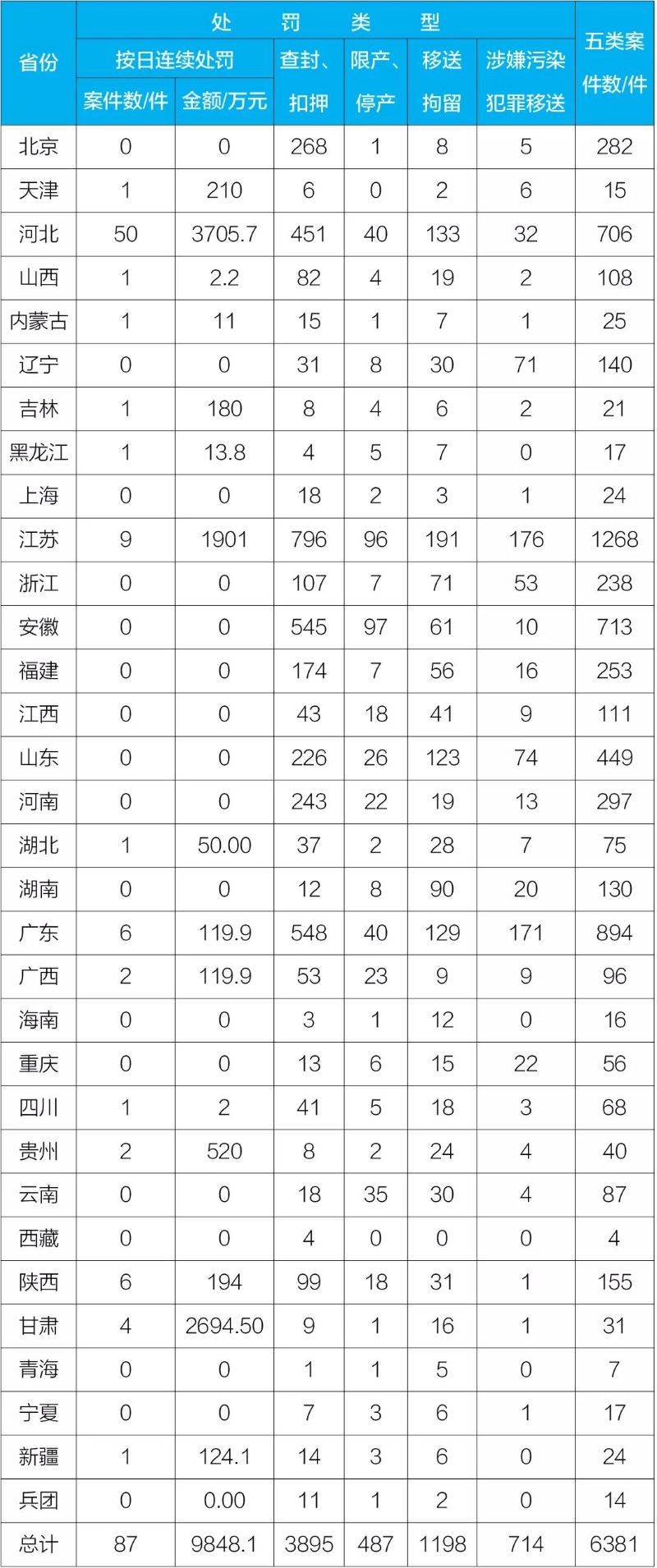 2021年1-6月,全國五類案件總數為6381件,其中,按日連續(xù)處罰案件數量為87件,罰款金額為9848.10萬元;適用查封、扣押案件數量為3895件;適用限產、停產案件數量為487件;移送拘留案件數量為1198件;移送涉嫌環(huán)境污染犯罪案件數量為714件。