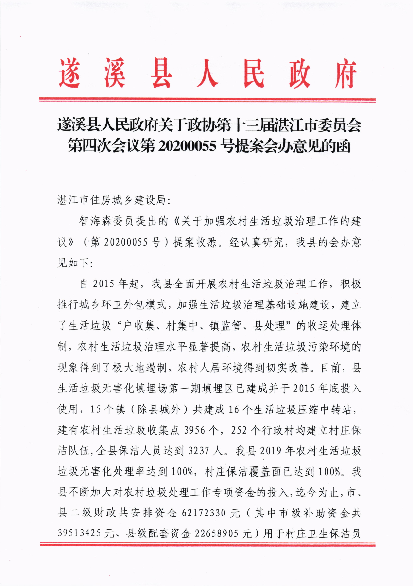 遂溪縣人民政府關(guān)于政協(xié)第十三屆湛江市委員會第四次會議第20200055號提案會辦意見的函