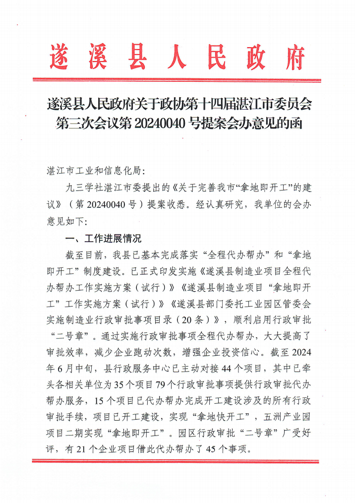 遂溪縣人民政府關(guān)于政協(xié)第十四屆湛江市委員會第三次會議第20240040號提案會辦意見的函