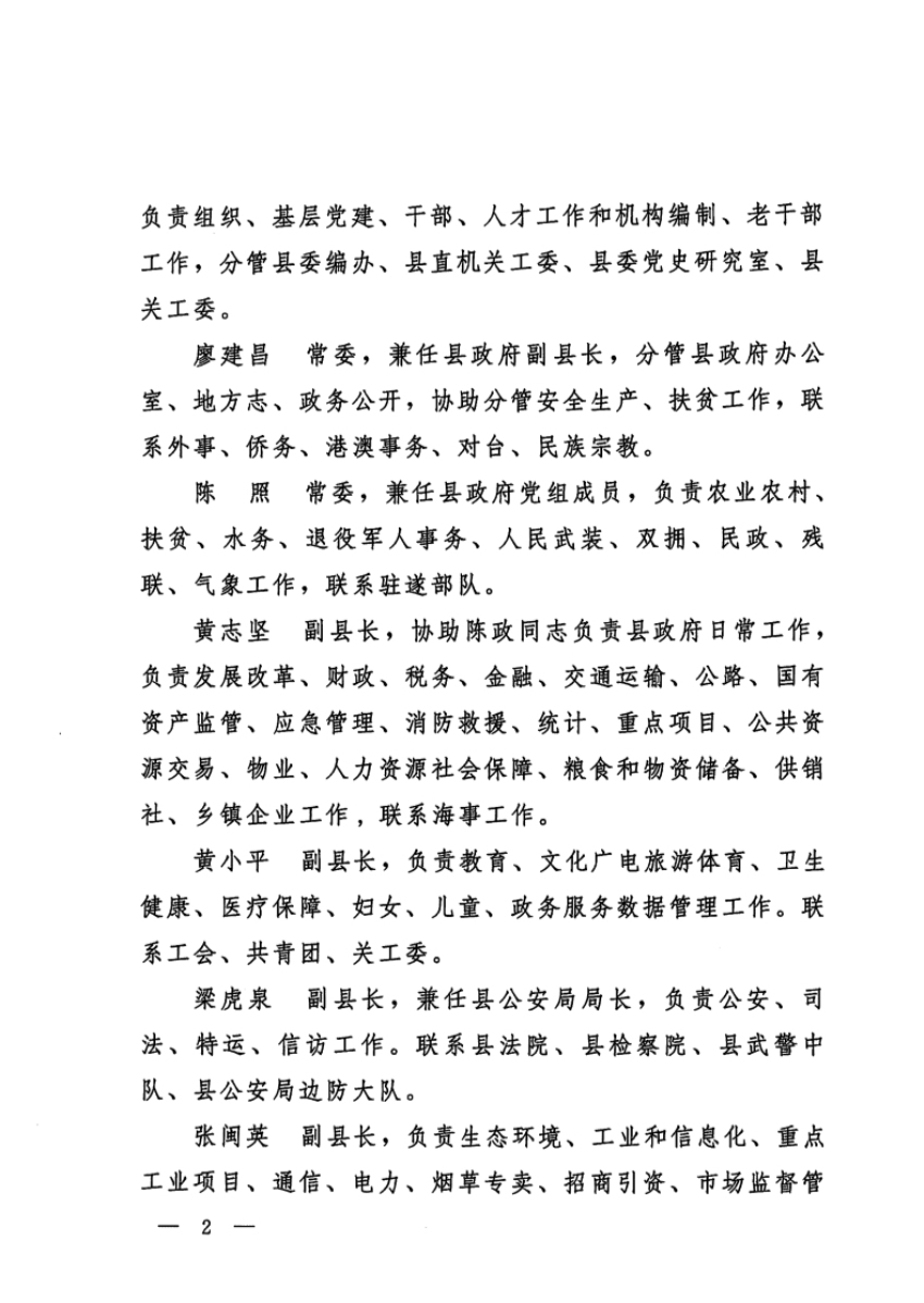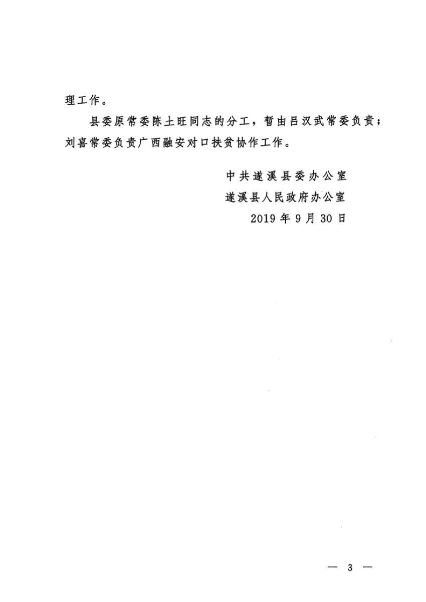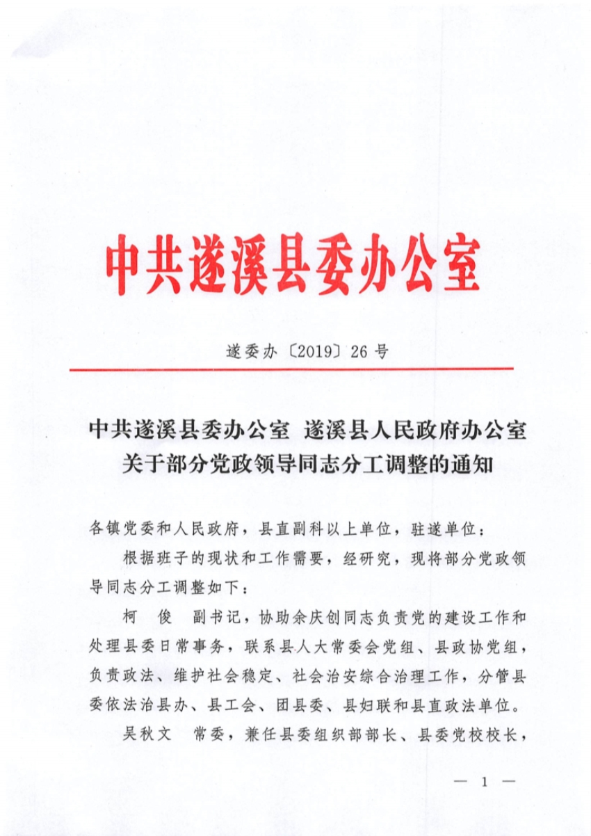 中共遂溪縣委辦公室 遂溪縣人民政府辦公室關(guān)于部分黨政領(lǐng)導(dǎo)同志分工調(diào)整的通知(遂委辦〔2019〕26號)